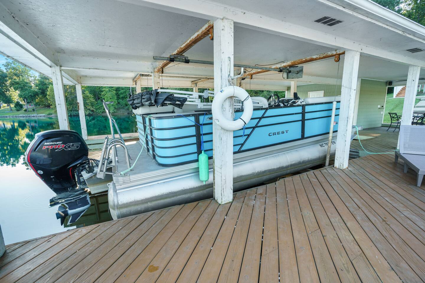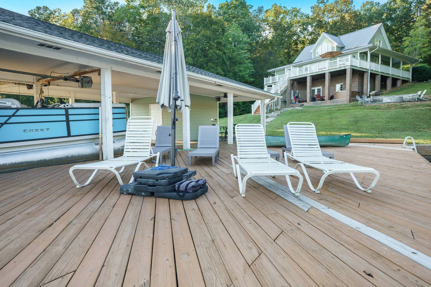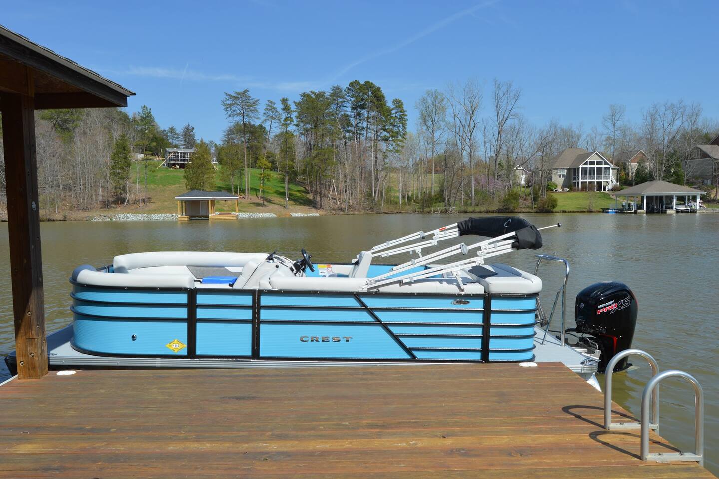 ADDITIONAL PONTOON BOAT RENTAL OPTIONS! With over 160 miles of shoreline to explore, your stay is not complete without a boat. BOAT RENTAL: Working in partnership with Hyco Lake Boat Rentals, we can provide a 2020 20’ Crest that has a 115HP motor. This is a relatively new boat that seats 10 passengers for cruise or 8 for water-sports. Perfect boat for exploring and relaxing on beautiful Hyco lake. Twenty-foot Sun Crest seats ten (at an absolute maximum). Go for a swim, drop anchor for a pristine picnic, or catch some Crappies, Catfish, or Bodie Bass. Contact us and let us help you have one or more of the best days ever on the water. If tubing only 8 are permitted on the boat (including those tubing). The boat is $350 a day or $1,550 for a week. if you arrive on a Sunday and leave the following Sunday, you will rent the boat for 6 full days which constitutes a week. If you only rent for a single day on the weekend from May to September then the price is $415 for the day. Note: If tubing only 8 are permitted on the boat Pontoon boat available for rent. Specifics on the logistics below. One boat slip available on request if you bring your own boat or you can tie up at the end of the dock. Note: The Boat Rental is also available for anyone who does not plan on renting with us, as long as the boat is available. Reach out to Hyco Lake Boat Rentals for that. • You can send a message to us as well for more information. • The renter needs to be 26 years old or older. The operator/s need to be legally permissible to operate a boat. • We are not held responsible if Hyco Lake Boat Rentals does not rent out boats due to restrictions or limitations on lake use due to weather conditions, safety advisories, or any other circumstances beyond our control.