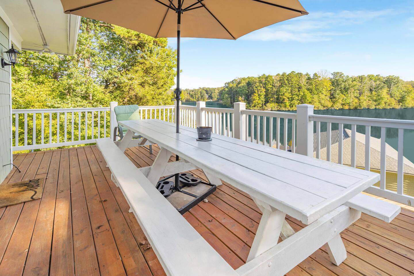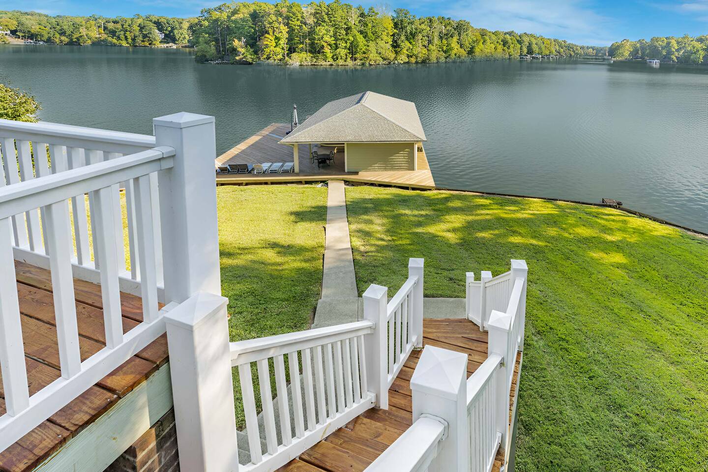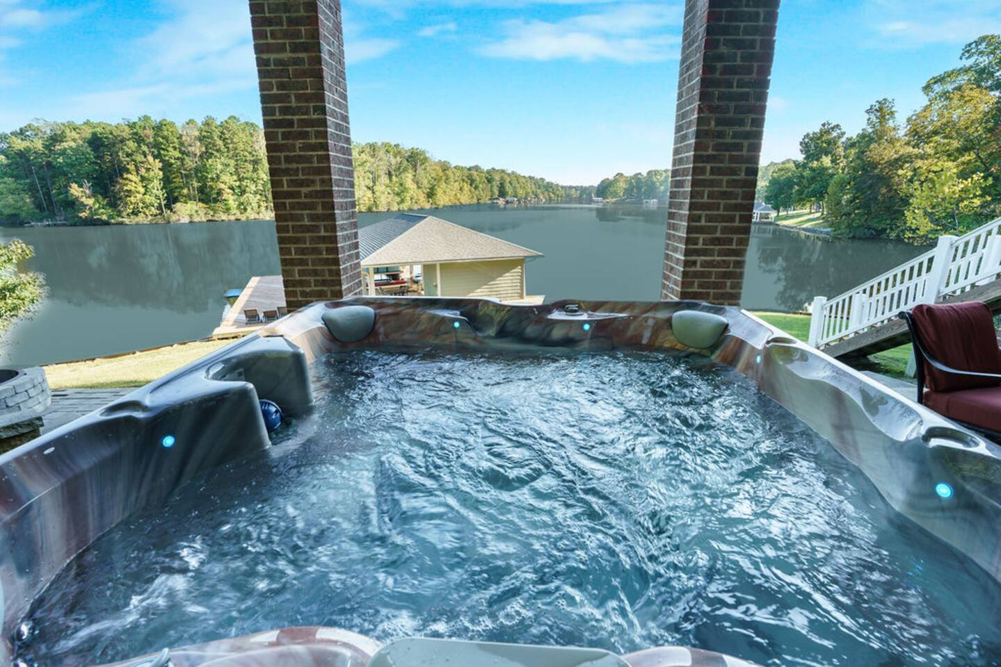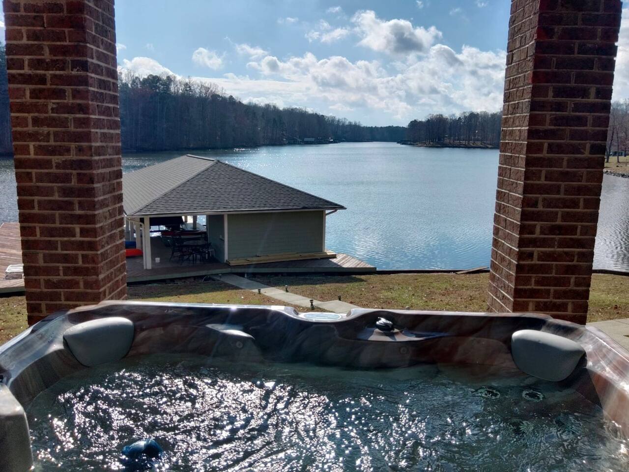 Life is better on the Lake!!! Our Hyco Home is located on a unique and private bend of the lake and provides an incredible water view and perspective. In March 2020, we renovated the home with new floors, carpets, kitchen counters, and appliances. In February 2021, we added a professional firepit that perfectly looks over the lake and renovated the upstairs bathroom. In May 2021, we also added Starlink Internet. This has greatly enhanced internet quality. We also added a brand new hot tub in December 2023. Feel free to also check out our sister property "Acorn Landing" and "Hidden Haven". The homes are completely renovated and have all the water toys and activities as well in order to make time on the lake truly great. As for this listing, there is plenty of room to sleep comfortably! Large Hyco Home has 12 beds that sleep 15 as well as couches/air mattresses. See below for more details on sleeping/bedroom arrangements. The home is also built to entertain! There are DVD's, board games, corn-hole, ping pong, pool table, a record collection, an arcade-style video-game console, and a Roku Stick with a Netflix account included (feel free to use your own streaming accounts as well). Relax by the electric fireplace or the high-end backyard fire pit! Large Hyco Home is fully equipped for groups that love to cook. There are two full kitchens! The main floor and newly renovated kitchen is fully stocked and the one in the basement is un-stocked but has a full sisze fridge, oven, and dishwasher. There is also a gas grill on the balcony and propane is provided. Guests enjoy plenty of space to have their meals! There are two dining room tables on the main floor, one in the eat-in area (6 people), one in the hybrid dining room (6 people), and a large table on the deck overlooking the water (10-12 people). A folding table can be brought up from the basement as well as chairs from the dock for another 6 on the porch. The dock also has a smaller 4 person table. The house was designed with the water in mind! A large sunny deck overlooks the lake with a wrap-around porch upstairs to relax over food and drinks. There is a shaded porch downstairs if you want to get out of the sun. The bedroom/sleeping layout is as follows: Main floor - Master: King bed with private bathroom (with Pack & Play) and 50 inch smart tv Hybrid dining room / bedroom: Can be set up as a bedroom with a day-bed and pull-out trundle or as a dining room. Second floor - Bedroom 2: Queen Bed w/ 43 inch smart-tv Bedroom 3: Queen Bed w/ 43 inch smart-tv Basement - Bedroom 4: Queen Bed w/ 50 inch smart-tv Bedroom 5: Four twin beds -- 1 is a pullout trundle Common area: Day-bed with pull-out trundle and air mattresses available If you need room for more, there are three big couches between the upstairs and downstairs great rooms and air mattresses. **NOTE: There is no refund if the jacuzzi is not working. We will try our best to make sure it is working and in good condition at all times but are not responsible for a refund if it isn't working or is off-line for repairs and maintenance All the lake house essentials are covered! Linens and bath/lake towels are included. Separate washer/dryer units with soap upstairs and downstairs for cleanup. Stay cool - two-zone AC and ceiling fans in every room. Starlink WiFi internet. Pontoon boat available for rent. Specifics on the boat and logistics below. One boat lift and power jet ski lift available on request if you bring your own boat or just tie up on the dock.