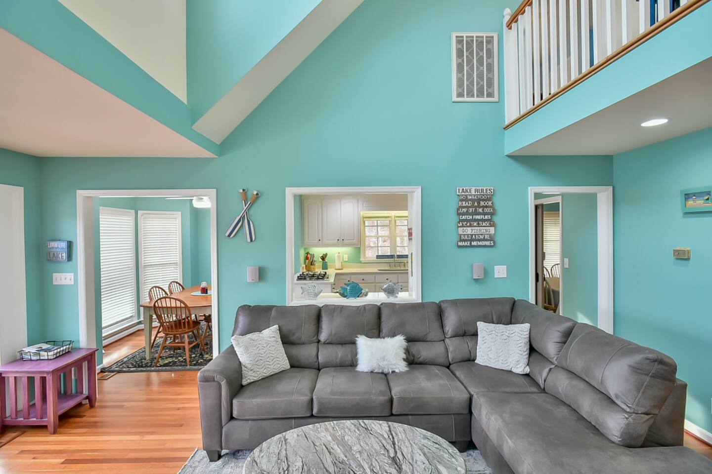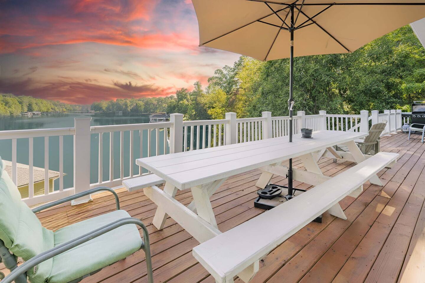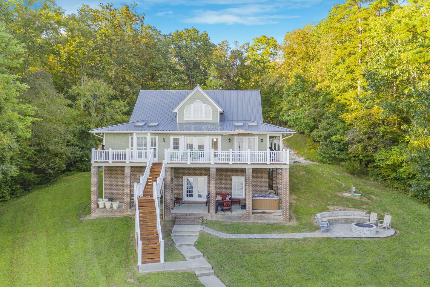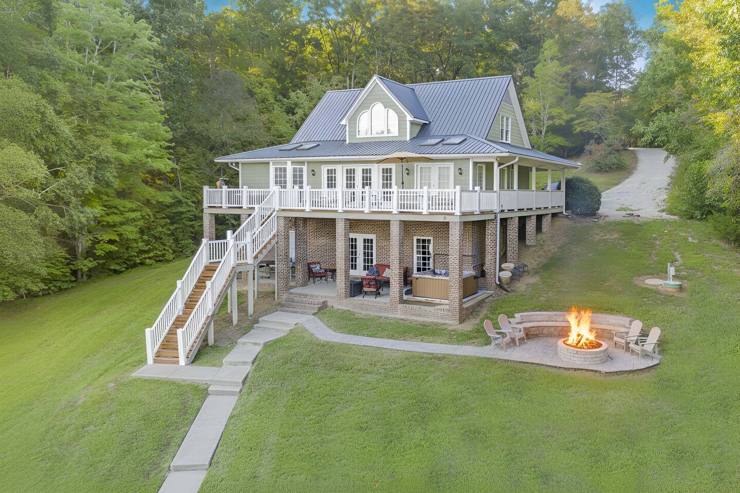 Life is better on the Lake!!! Our Hyco Home is located on a unique and private bend of the lake and provides an incredible water view and perspective. In March 2020, we renovated the home with new floors, carpets, kitchen counters, and appliances. In February 2021, we added a professional firepit that perfectly looks over the lake and renovated the upstairs bathroom. In May 2021, we also added Starlink Internet. This has greatly enhanced internet quality. We also added a brand new hot tub in December 2023. Feel free to also check out our sister property "Acorn Landing" and "Hidden Haven". The homes are completely renovated and have all the water toys and activities as well in order to make time on the lake truly great. As for this listing, there is plenty of room to sleep comfortably! Large Hyco Home has 12 beds that sleep 15 as well as couches/air mattresses. See below for more details on sleeping/bedroom arrangements. The home is also built to entertain! There are DVD's, board games, corn-hole, ping pong, pool table, a record collection, an arcade-style video-game console, and a Roku Stick with a Netflix account included (feel free to use your own streaming accounts as well). Relax by the electric fireplace or the high-end backyard fire pit! Large Hyco Home is fully equipped for groups that love to cook. There are two full kitchens! The main floor and newly renovated kitchen is fully stocked and the one in the basement is un-stocked but has a full sisze fridge, oven, and dishwasher. There is also a gas grill on the balcony and propane is provided. Guests enjoy plenty of space to have their meals! There are two dining room tables on the main floor, one in the eat-in area (6 people), one in the hybrid dining room (6 people), and a large table on the deck overlooking the water (10-12 people). A folding table can be brought up from the basement as well as chairs from the dock for another 6 on the porch. The dock also has a smaller 4 person table. The house was designed with the water in mind! A large sunny deck overlooks the lake with a wrap-around porch upstairs to relax over food and drinks. There is a shaded porch downstairs if you want to get out of the sun. The bedroom/sleeping layout is as follows: Main floor - Master: King bed with private bathroom (with Pack & Play) and 50 inch smart tv Hybrid dining room / bedroom: Can be set up as a bedroom with a day-bed and pull-out trundle or as a dining room. Second floor - Bedroom 2: Queen Bed w/ 43 inch smart-tv Bedroom 3: Queen Bed w/ 43 inch smart-tv Basement - Bedroom 4: Queen Bed w/ 50 inch smart-tv Bedroom 5: Four twin beds -- 1 is a pullout trundle Common area: Day-bed with pull-out trundle and air mattresses available If you need room for more, there are three big couches between the upstairs and downstairs great rooms and air mattresses. **NOTE: There is no refund if the jacuzzi is not working. We will try our best to make sure it is working and in good condition at all times but are not responsible for a refund if it isn't working or is off-line for repairs and maintenance All the lake house essentials are covered! Linens and bath/lake towels are included. Separate washer/dryer units with soap upstairs and downstairs for cleanup. Stay cool - two-zone AC and ceiling fans in every room. Starlink WiFi internet. Pontoon boat available for rent. Specifics on the boat and logistics below. One boat lift and power jet ski lift available on request if you bring your own boat or just tie up on the dock.